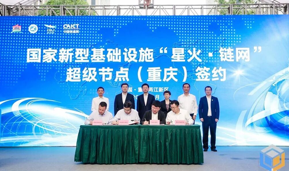 2020年9月16日,在国家顶级节点(重庆)展示体验中心,中国信息通信研究院(以下简称“中国信通院”)与重庆两江新区管理委员会、重庆市经济和信息化委员会、重庆市通信管理局四方共同签署“星火·链网”合作协议,确定“星火•链网”这一国家区块链与工业互联网协同创新新型基础设施的首个超级节点正式签约落地重庆。